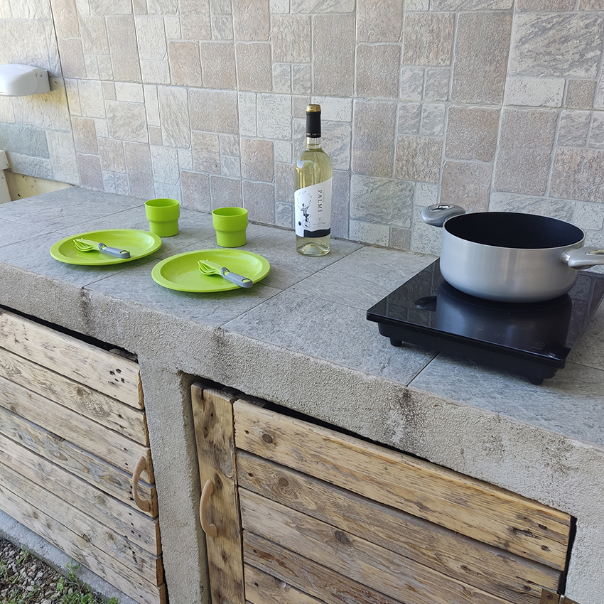 Zona esterna con piano a induzione, padelle, piatti e bicchieri, etc.. dove puoi goderti un aperitivo, pranzare o cenare all’aperto, o prepararti un barbecue.